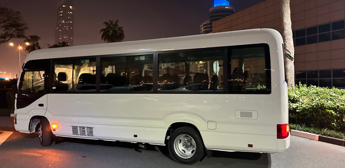 Experience Dubai & Abu Dhabi in luxury. Our new 2024 Toyota Coaster minibus offers spacious comfort with plush seating and ample legroom. Panoramic windows and powerful A/C ensure a pleasant journey. Relax and focus on creating memories, while our professional drivers navigate safely.
